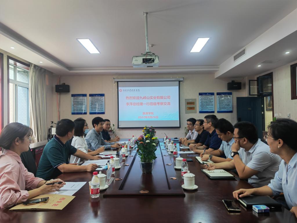 为进一步加强校企合作,提升专业服务行业能力,深入推进落实关于高校“访企拓岗促就业”专项行动和“百名专家助百村(企)”工程”号召,8月26日,河南九峰山实业有限公司李萍总经理、白宝珠副总经理、唐丙丙副总经理等一行五人受邀来公司洽谈校企合作事宜。经理王德静、副经理王中雨、陈道山及旅游管理、旅游基础与创新、酒店管理教研室主任等人员参加了座谈交流。