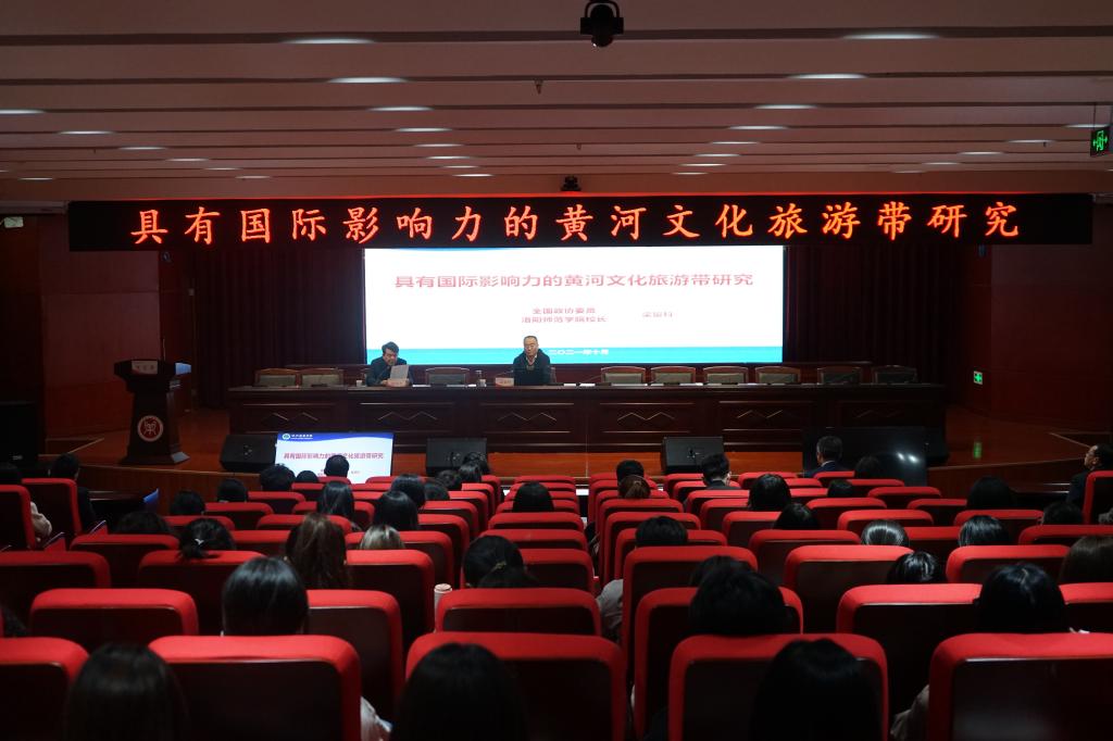 梁留科教授阐述了黄河文化旅游带研究在国家战略中的重大地位以及具有国际影响力的深层原因,提出“挖掘黄河文化的时代价值,建设黄河文化保护传承弘扬承载区”、“以黄河国家文化公园建设为抓手,建设中华文化自信标识带”、“以国家级文化生态保护实验区建设为抓手,建设世界级文化遗产保护走廊”、“以打造黄河文化古都旅游带为核心,打造世界级历史文化旅游目的地”、“实施黄河文化精品创作工程,形成中国黄河大品牌”、“讲好黄河故事,增强人民文化自信与获得感”、“建设黄河干部学院,做好黄河文化时代精神挖掘与当代传播”和“着力推动国际人文中心建设,大力推动黄河文化的国际传播”等主张,并详细列示“做好顶层设计,高起点定位黄河文化旅游带建设”、“建立联动机制,高效率推进黄河文化旅游带建设”、“组建智库团队,高规格谋划黄河文化旅游重点工程”、“注重遗产活化,高颜值构筑黄河文化旅游空间”和“讲好黄河故事,高品质设计黄河文化旅游文旅产品体系”等五大具体举措。他还重点如何打造“华夏文明主根、国家历史主脉、治黄史诗主题”三条主游线以及如何利用好“互联网+”等现代信息技术活化黄河文化旅游资源等方面发表了颇具理论深度的见解。梁留科教授高深的学术造诣、深邃的洞察力和独到的见解获得了在场师生们的阵阵掌声。